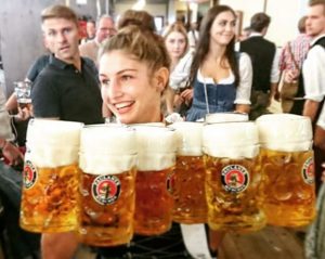 A litre of beer in the common glass mugs weigh around 2.4kgs each, and waiters at the beer fest will carry a stack at a time back and forth between the bar and various tables all day from the opening at 10 am till closing just before midnight.